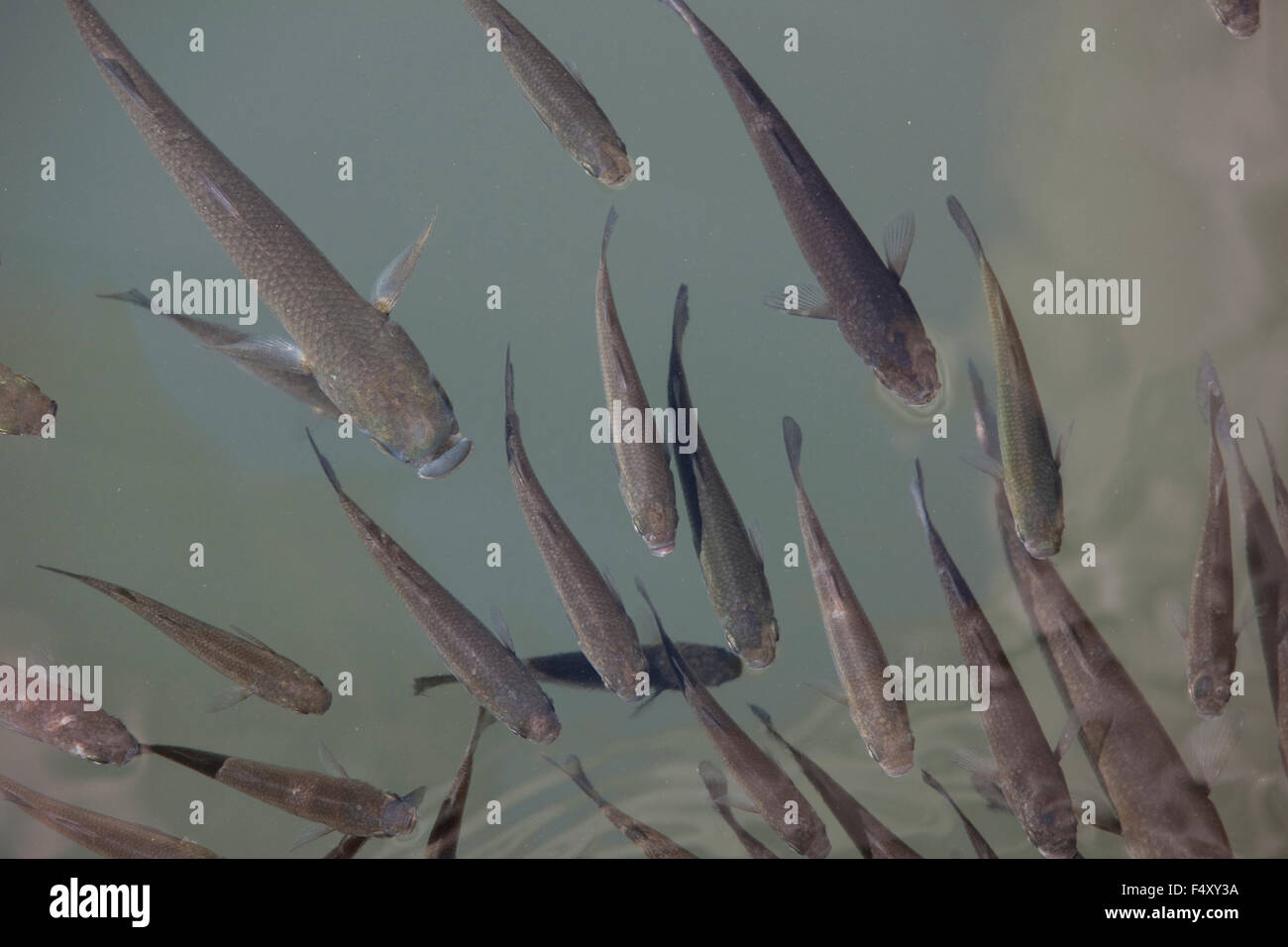 Large crates with grey mullet fish ready for transport. The mullet are concentrated together and sent into a feeding frenzy by chumming with laying mash chicken feed. Striped mullet have two well-separated dorsal fins the first one with four spines pectoral fins that join the fishs body above the midline towards its back and no lateral line.