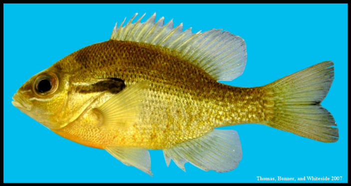 It resembles a fish head with a tail and its main body is flattened laterally. 06082008 Back sides and fins of breeding males turn dark along with yellow margins on the fins Life History Green Sunfish are most common in small warm streams with turbid mud-bottom pools and aquatic vegetation and are especially prevalent. Colors which become much brighter during the spawning season.